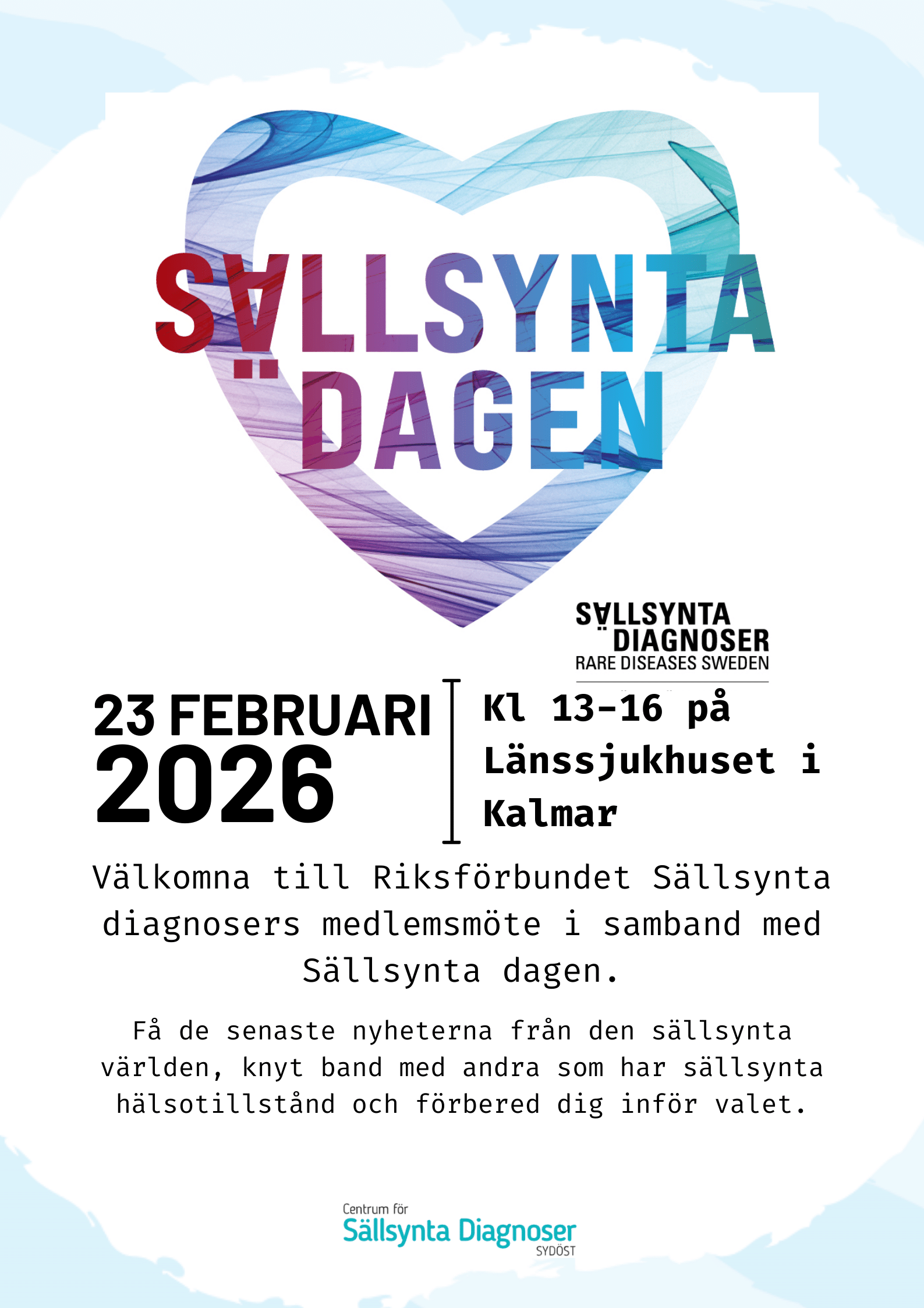 CSD arbetar för att personer med sällsynta hälsotillstånd ska få samma möjlighet till diagnos, behandling och service som andra. Vi söker och samordnar kunskap och expertis, stöttar i kontakt med myndigheter och andra aktörer, skapar mötesplatser och driver frågan om gemensamt samhällsansvar. På så sätt hoppas vi bidra till en bättre livssituation för varje individ – och till ett bättre samhälle. Varmt välkommen till CSD Sydöst!
